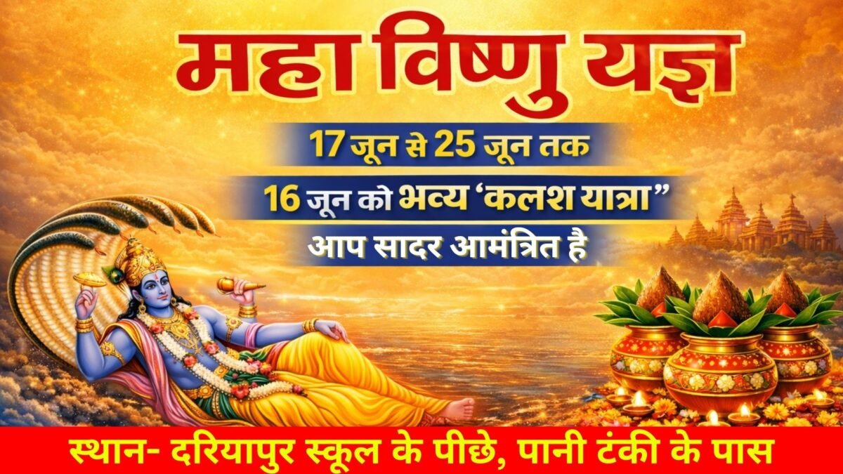 Maha Vishnu Yagya : जेठ मास के पावन अवसर पर दरियापुर समाज, भागलपुर द्वारा आयोजित महा विष्णु यज्ञ श्रद्धा, भक्ति और धार्मिक उत्साह के साथ 17 जून से 25 जून तक संपन्न होगा। इस दिव्य आयोजन का उद्देश्य समाज में धर्म, संस्कार और सकारात्मक ऊर्जा का प्रसार करना है।